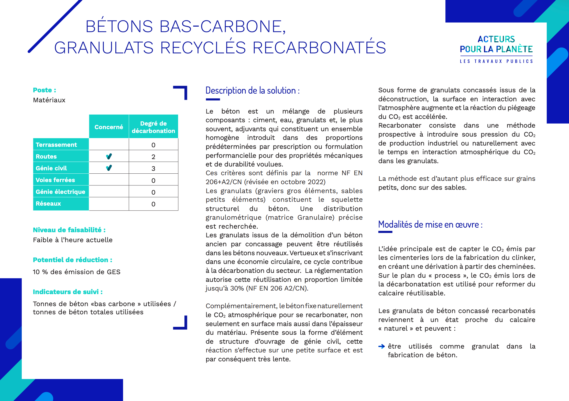 Les granulats issus de la démolition d’un béton ancien par concassage peuvent être réutilisés dans les bétons nouveaux. Vertueux et s’inscrivant dans une économie circulaire, ce cycle contribue à la décarbonation du secteur. La réglementation autorise cette réutilisation en proportion limitée jusqu’à 30% (NF EN 206 A2/CN).