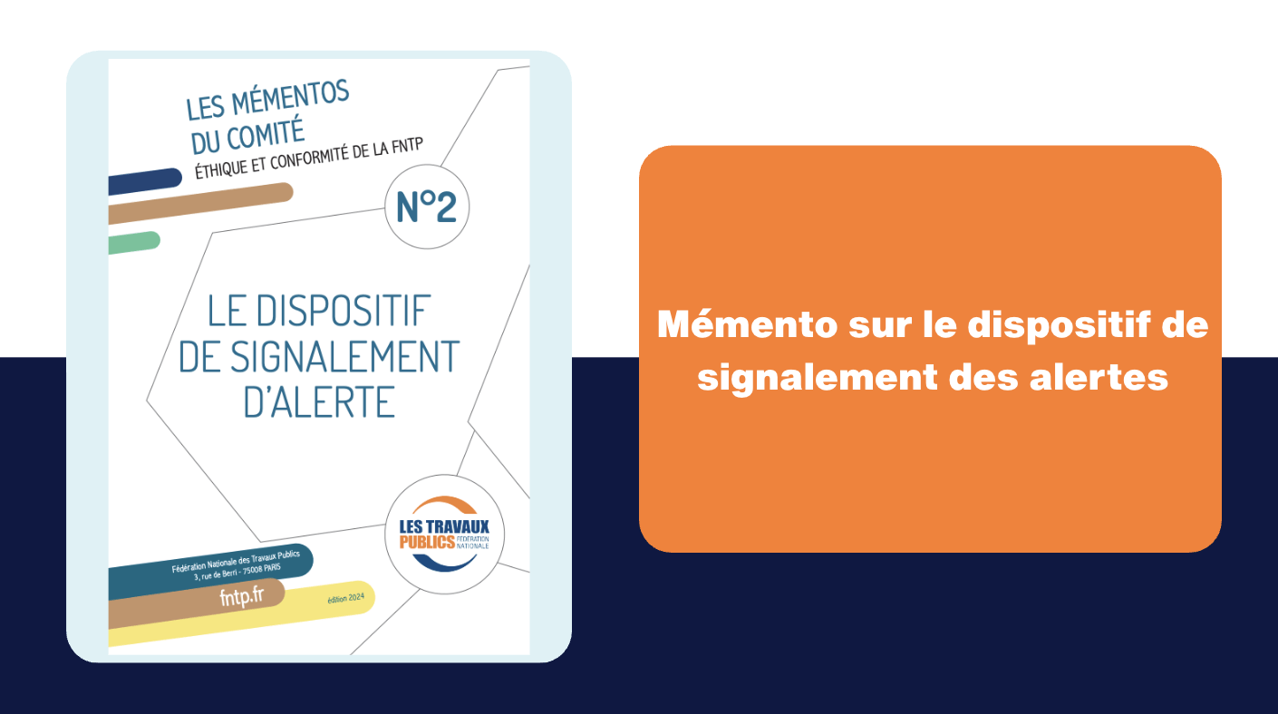 Le Comité "Ethique et Conformité" de la FNTP a élaboré un Mémento afin d'aider les entreprises soumises aux obligations de la loi Sapin 2 à se conformer à leur obligation de mise en place d'un dispositif d’alerte interne destiné à permettre le recueil et le traitement des signalements émis par les membres de leur personnel ou par des collaborateurs extérieurs et occasionnels.