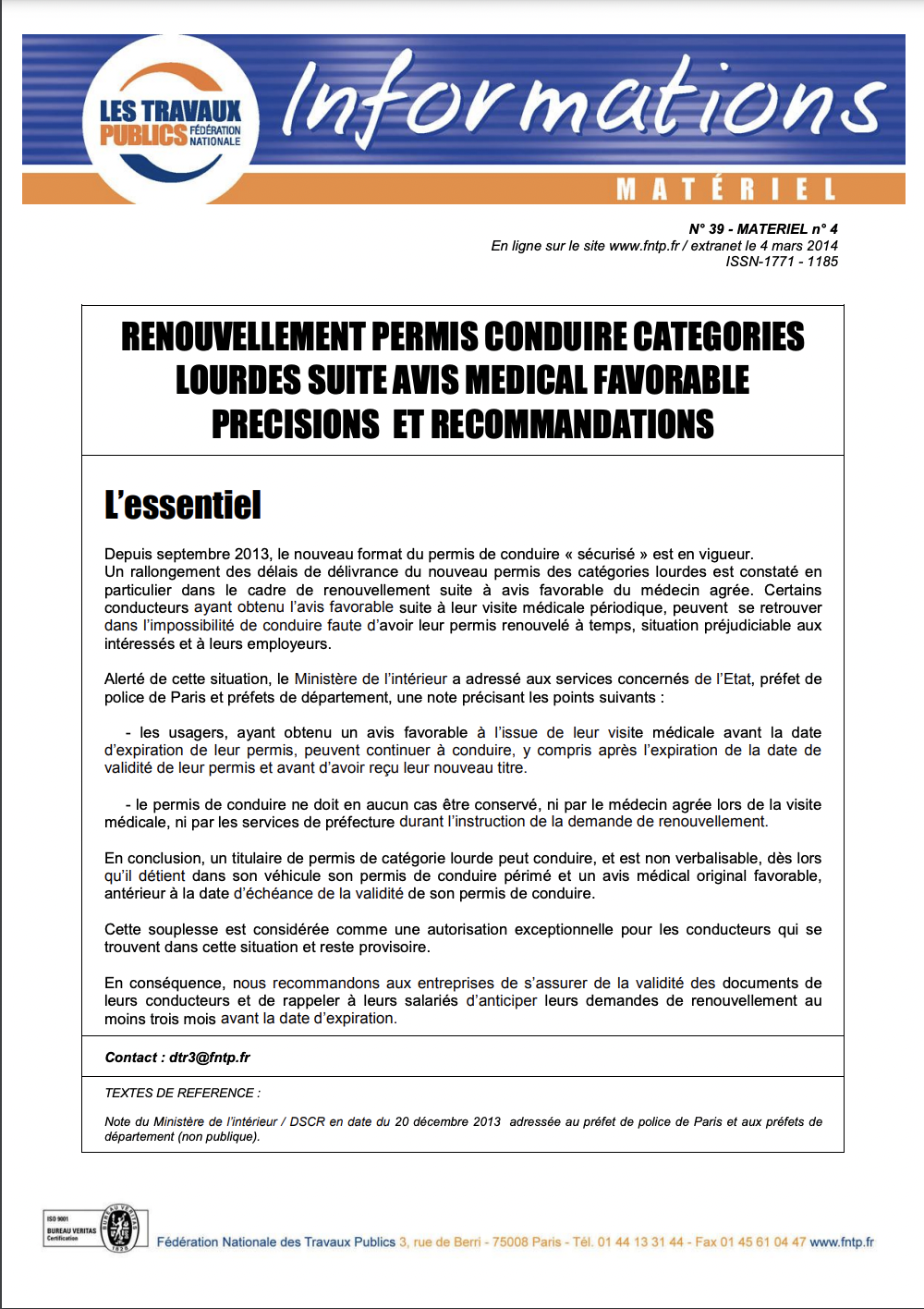 Depuis septembre 2013, le nouveau format du permis de conduire « sécurisé » est en vigueur. Un rallongement des délais de délivrance du nouveau permis des catégories lourdes est constaté en particulier dans le cadre de renouvellement suite à avis favorable du médecin agrée. Certains conducteurs ayant obtenu l’avis favorable suite à leur visite médicale périodique, peuvent se retrouver dans l’impossibilité de conduire faute d’avoir leur permis renouvelé à temps, situation préjudiciable aux intéressés et à leurs employeurs.